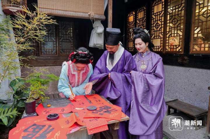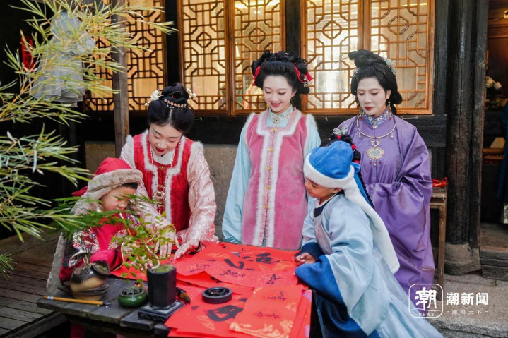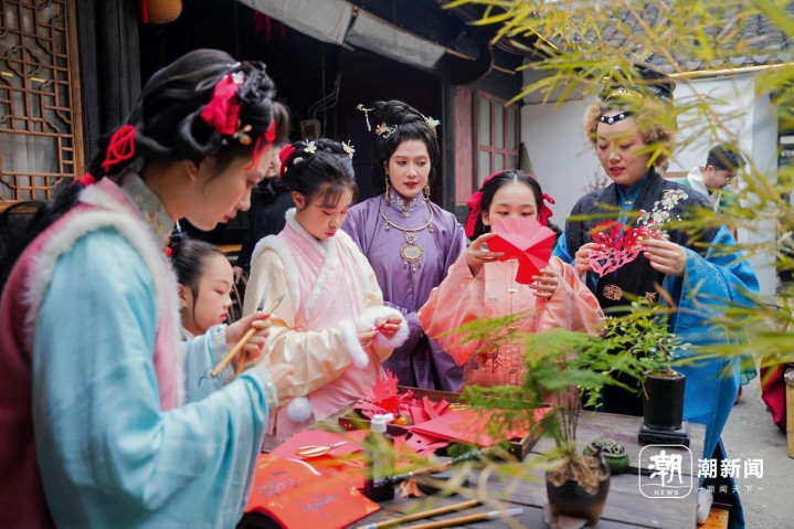 1月25日,“如故国风体验馆”张灯结彩,热闹非凡。体验馆内,身着各种传统服饰的市民们或围坐一起写福字、剪窗花,或相互交流传统服饰文化。小朋友们在家长的带领下,好奇地摆弄着剪纸工具,一笔一划写下稚嫩却饱含祝福的“福”字。